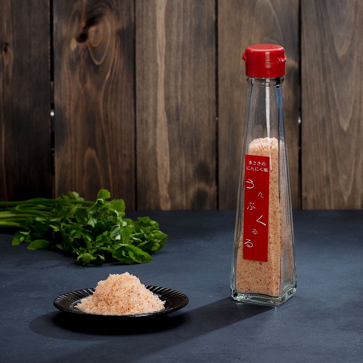 天草灘の海水塩と熊本県産のにんにくを使用し、化学調味料を一切使わず、まさきと塩職人が作り上げたこだわりの逸品です。にんにくの風味と赤唐辛子の辛みが効いた食感に溺れるかも。唐揚げ、焼肉、野菜炒め、魚フライ、炒飯など、いろんなお料理にお使いいただける万能調味料です。
